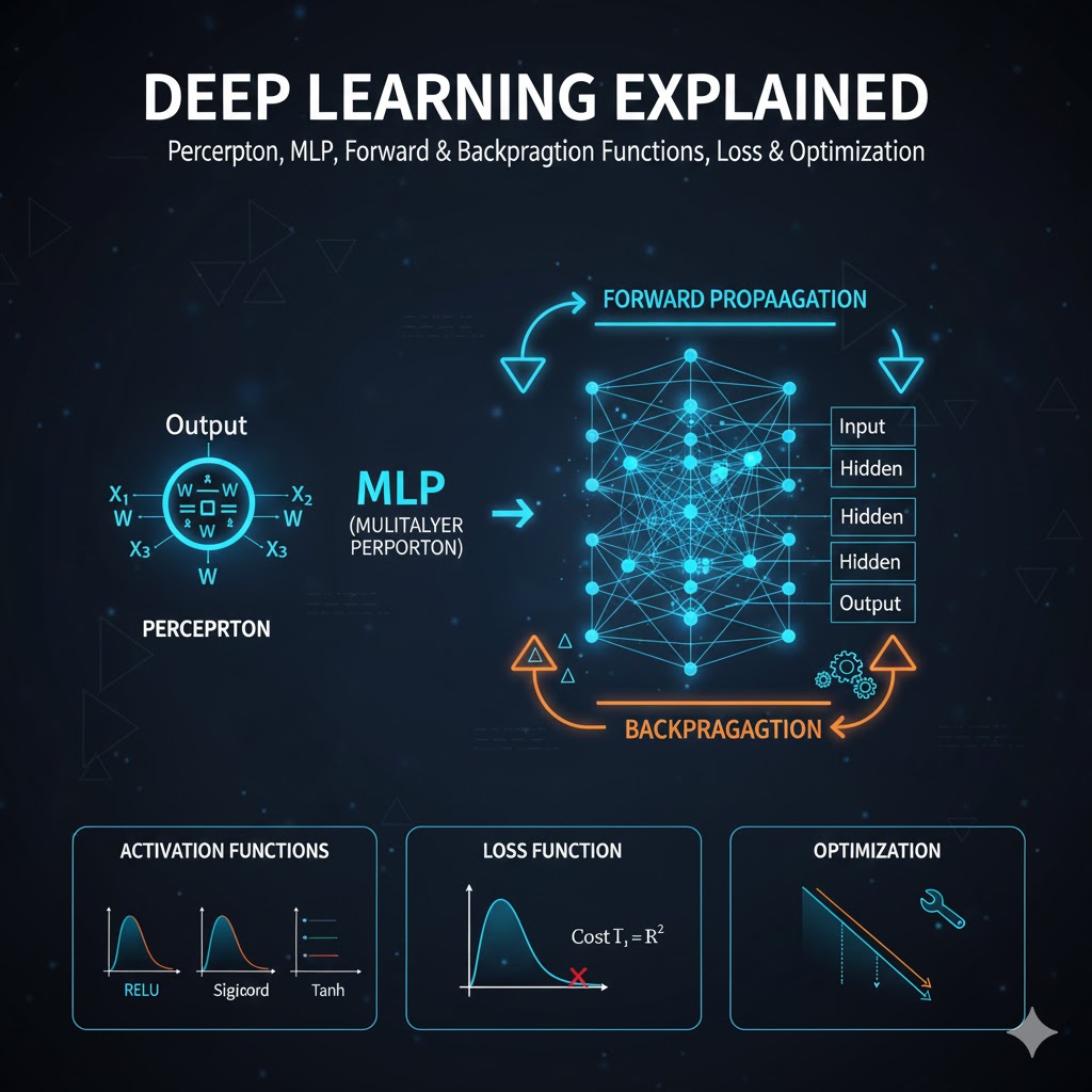 • Deep Learning Explained: Perceptron, MLP, Forward & Backpropagation, Activation Functions, Loss & Optimization