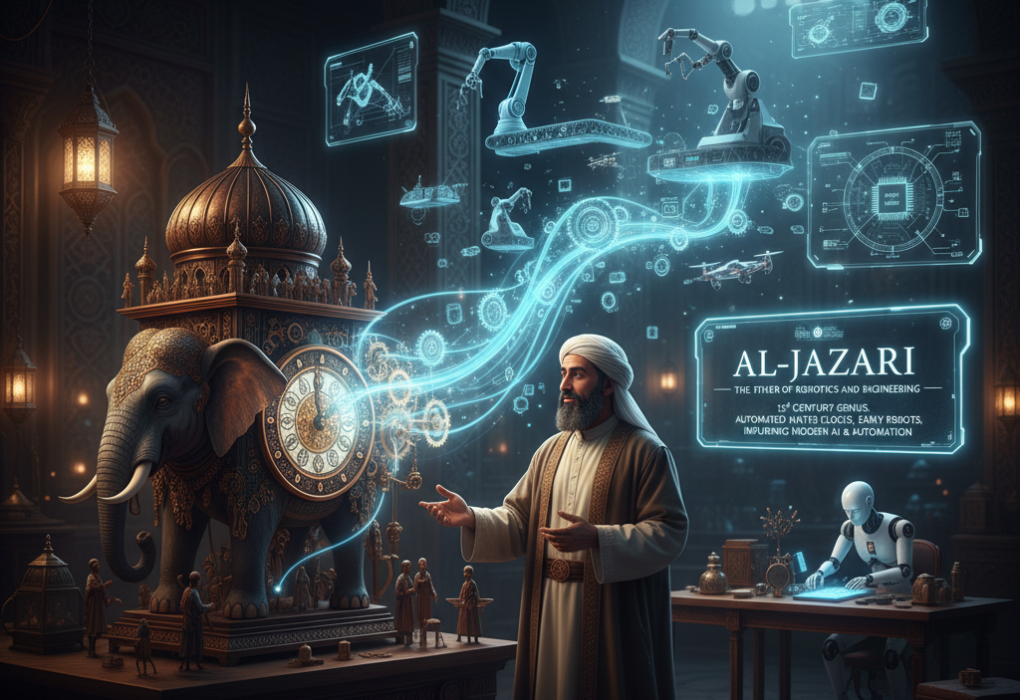 Al-Jazari, the 12th-century Muslim engineer, was the father of robotics and mechanical engineering. His inventions — from automated water clocks to humanoid machines — revolutionized science centuries before the industrial age, blending art, faith, and innovation into timeless genius